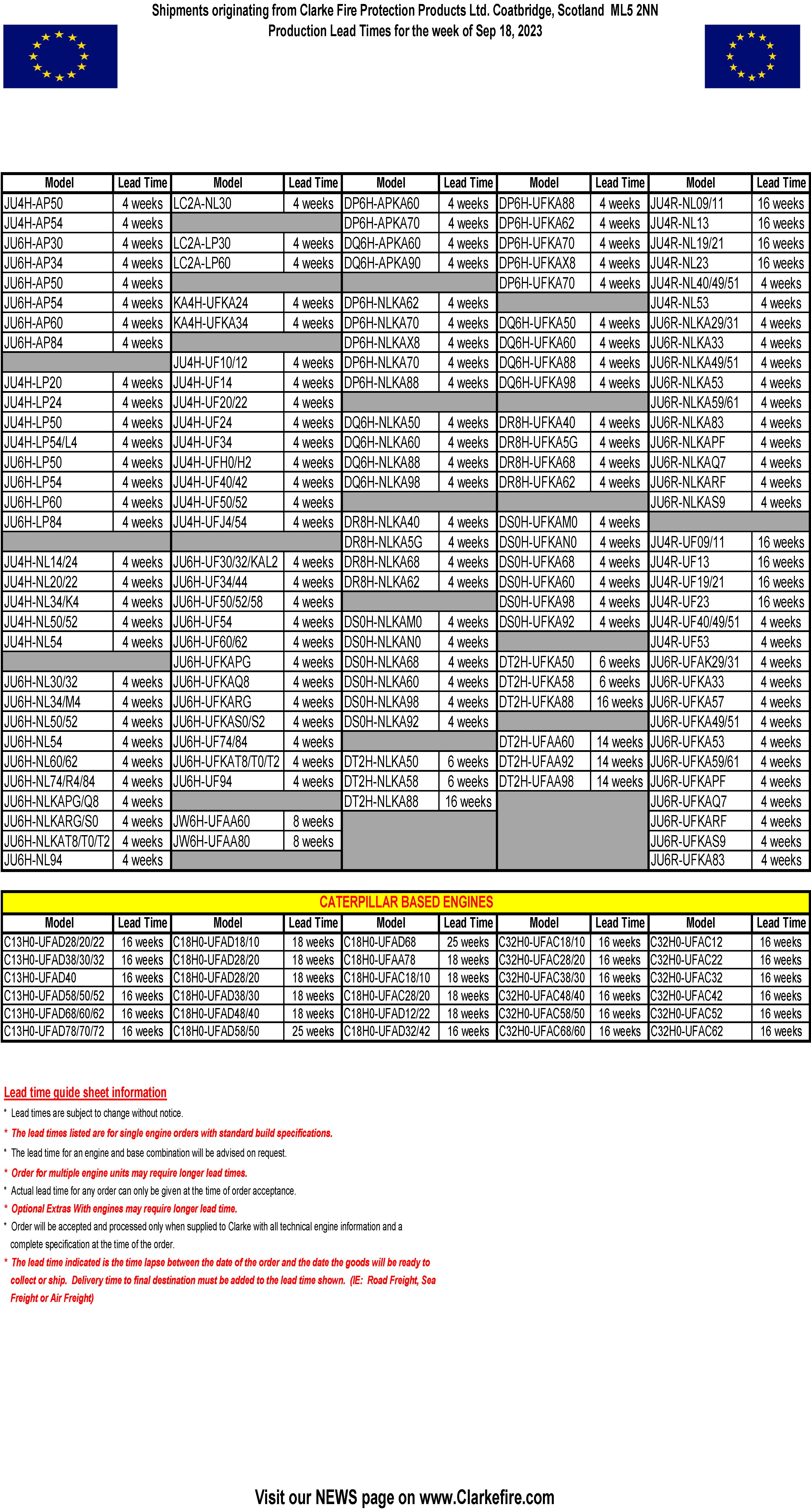 Clarke Scotland Engine Lead Times are published weekly and subject to change. Please contact Clarke Scotland's order processing team to confirm lead times.